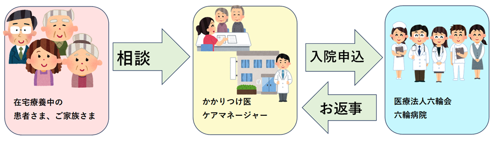 入院希望日の1か月前までに、かかりつけ医又はご自身の担当ケアマネジャーを通してお申し込みいただきます。(緊急時はこの限りではありません)